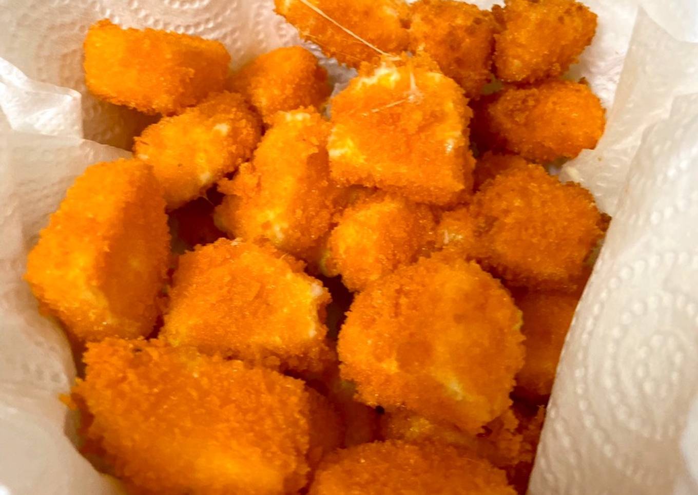 - Heat oil in a deep pan. Put few bites (4-5) in one batch because have to fry for very short time. Fry until traces of melting cheese shows (that would be few seconds) then take them out or cheese will melt and mix inside oil. This is just more than enough and takes very short time yet comes out crispy, stringy and yummy.