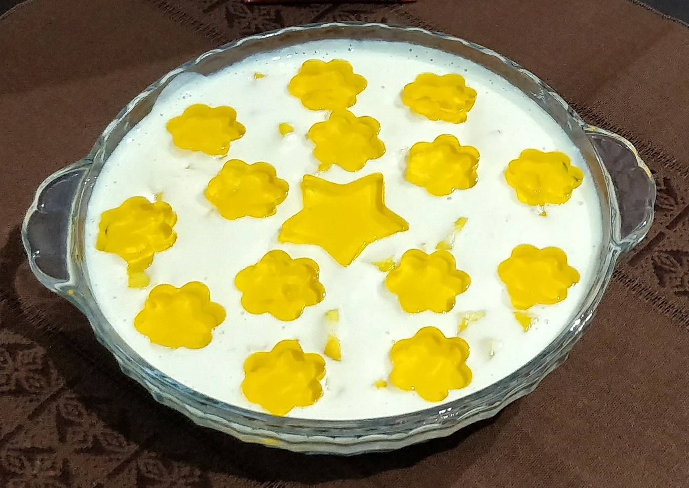 - Pour half mixture into the dish and add remaining mangoes pieces. Then pour remaining mixture into the dish.