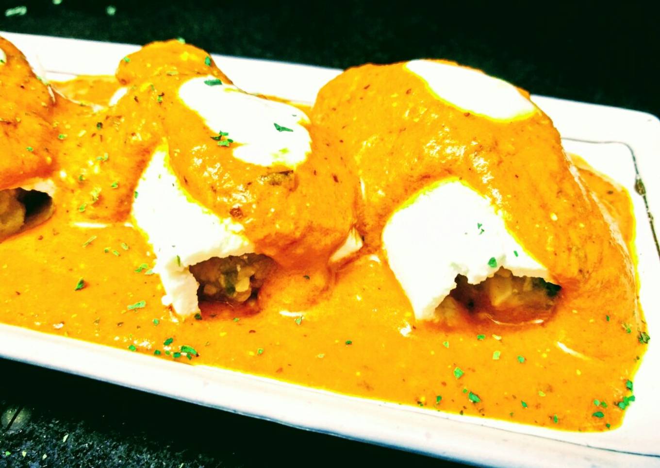 - Now for serving, first pour some gravy in the serving plate, place the ready paneer rolls, diagonally on the gravy, now pour the gravy on these rolls, garnish with cream and kasoorimethi