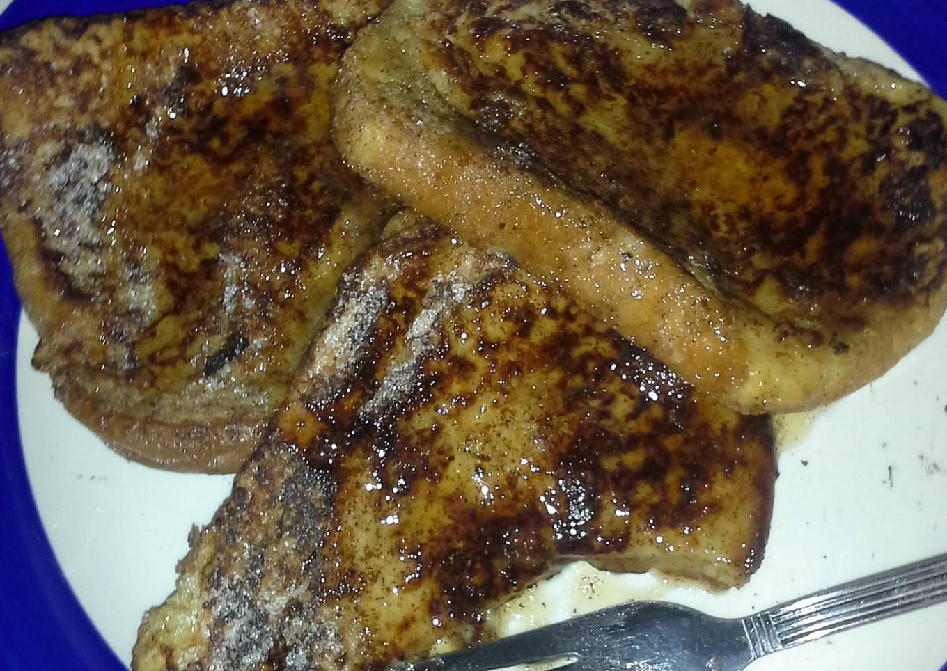 - Take sliced bread and dip in egg milk mix and get it nice and wet then put in pan cook till both sides are brown and inside toast is dun