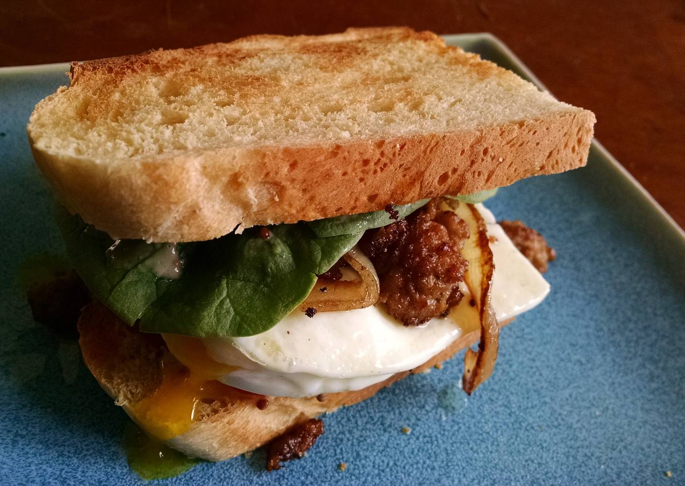 - Spread whole grain mustard and balsamic spread on toasted bread. Add one fried egg, sliced tomatoes, a few spinach leaves, and sauteed meatballs and onion to create the Mediterranean Brunch Sandwich!