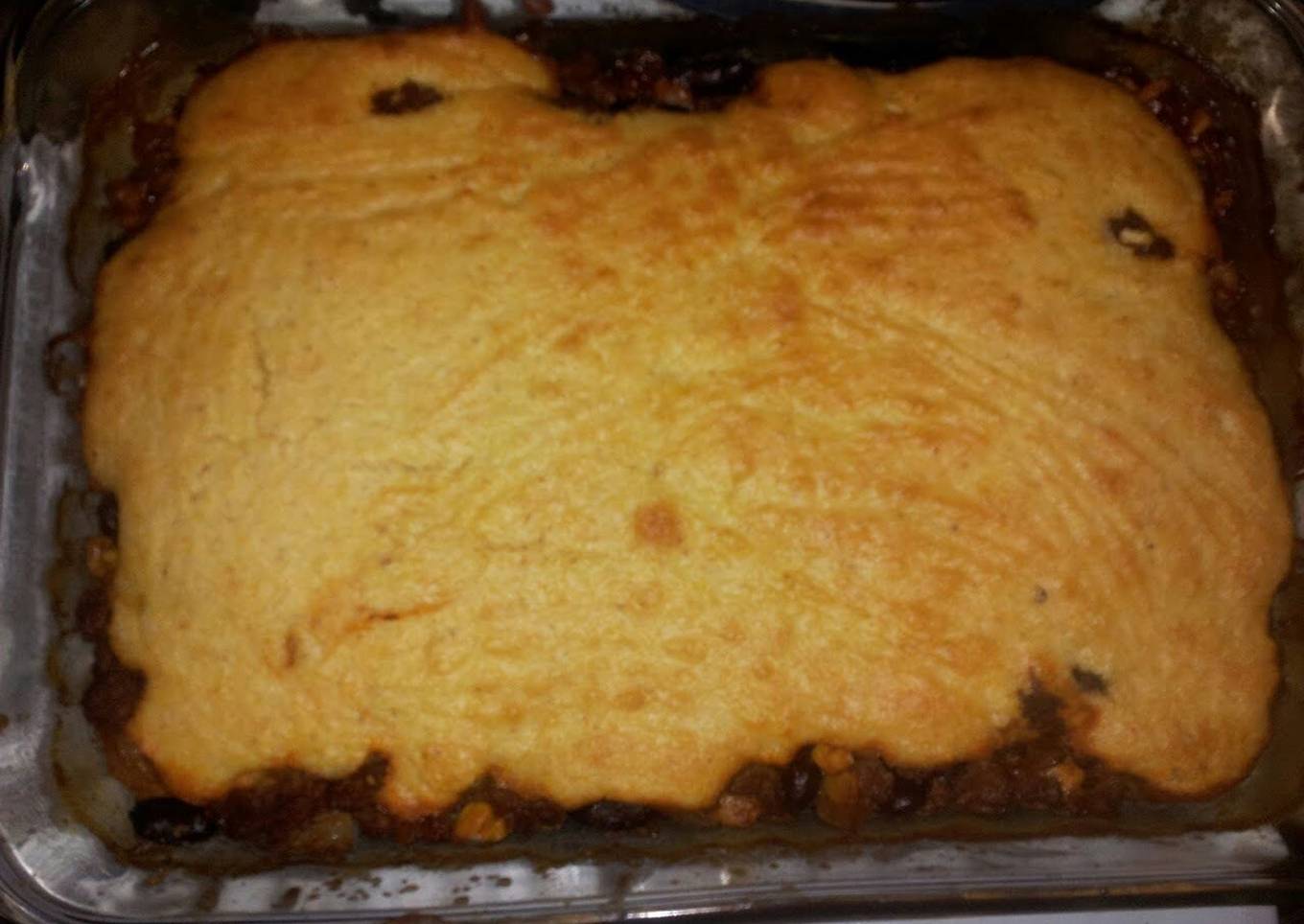 - Prepare cornbread batter and carefully cover the meat mixture with batter.