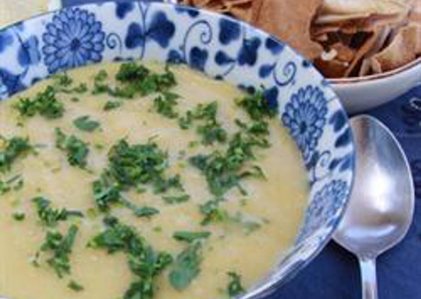 A pureed yellow lentil soup flavored with cumin and garnished with fresh parsley. It is traditionally served during Ramadan.